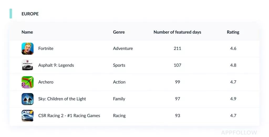 在欧洲地区,《堡垒之夜》受推荐的次数达到了第二名《狂野飙车9:竞速传奇》的2倍。《Lego Tower》和《糖果好友传奇》在该地区获较多“今日游戏”推荐,《CSR Racing》是少有入围的竞速游戏。