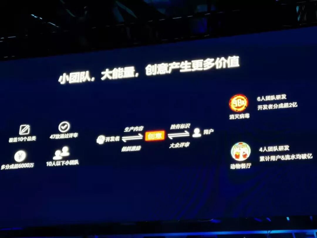 创意小游戏方面,自2019年1月正式对用户开放以来,经过一年的时间,已有47款通过评审,累计覆盖10个品类,多分成超过6000万;有5款产品累计流水过千万,甚至超过3亿。其中,由6人团队研发的小游戏《消灭病毒》累计流水超过3.5亿、开发者分成超过2亿;由4人团队研发的《动物餐厅》小游戏累计用户及流水均破亿。