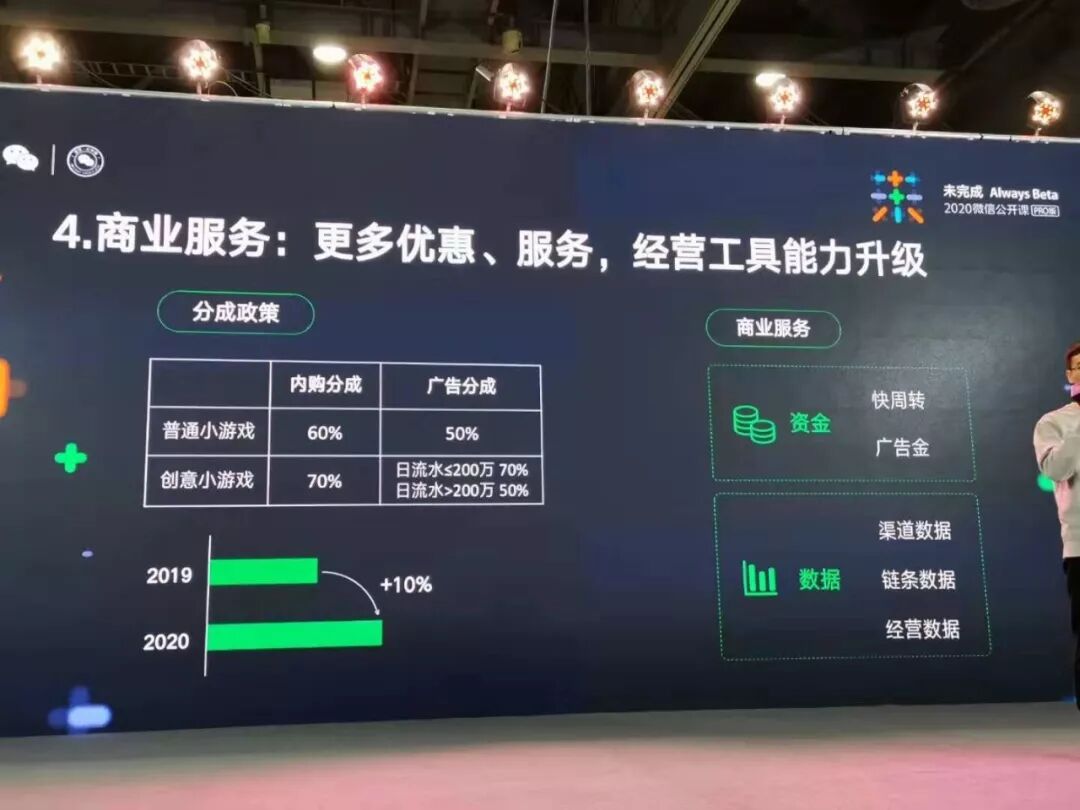 而一个健康的游戏平台,除了有好的内容以外,还需要有一个能很好地帮助开发者成长的商业环境。在商业方面,2020年小游戏的优惠力度将比2019年增加10%。在小游戏广告与道具流水分成规则保持不变的前提下,单款产品Android道具内购低于月50万,赠送流水金额50%广告金,高达25万;超过月50万,并使用快周转服务赠送50%广告金,转赠部分为超过50万元部分的10%。