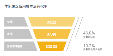 买量成本也受竞争的增多而有所增加。近3年来的手游出海热潮,推升了海外市场的买量成本。市场调研公司Liftoff通过对近一年内推出的500多款应用研究后发现,出海手游厂商大约花费4.35美元买到一个新iOS用户,成本同比增长16.5%;而一个付费用户,厂商买量的平均成本在35.42美元左右。在休闲游戏方面, 2019年CPI为3.22美元,CPP为30.05美元,对比2018年分别增长3.2%与11.1%。