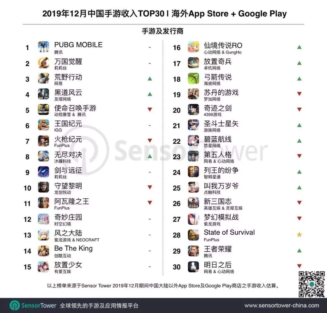 1月10日,Sensor Tower发布了12月中国手游产品在海外市场收入排名TOP30。12月上榜的游戏变化较小,除排名有波动外,进入前15名的游戏和11月榜单完全重合,TOP30和11月相比也仅有不足5款游戏挤进榜单。