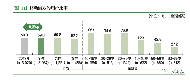 在调查对象中,有一半以上(59.0%)的人近期玩过移动游戏,这与2018年的调查结果(59.3%)基本持平。按性别来看,男女用户的比率没有太大差距;按年龄来看,不满40岁的用户比率相对高于40岁以上的用户。