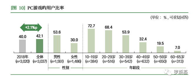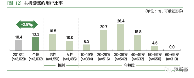 主机游戏的用户比率为13.3%。即在调查对象中,每十名中有一名是主机游戏用户。这比2018年上升了2.9%p。按性别来看,男性用户的比率高于女性用户;按年龄来看,20~29岁和30~39岁的用户比率相对高于其他年龄段。
