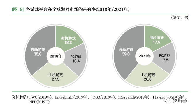 预计今后全球游戏市场的销售将继续集中到移动游戏,到2021年时占有率将达到 39.0%。受其影响,预计PC、主机游戏、街机游戏的销售比重会比2018年下降。