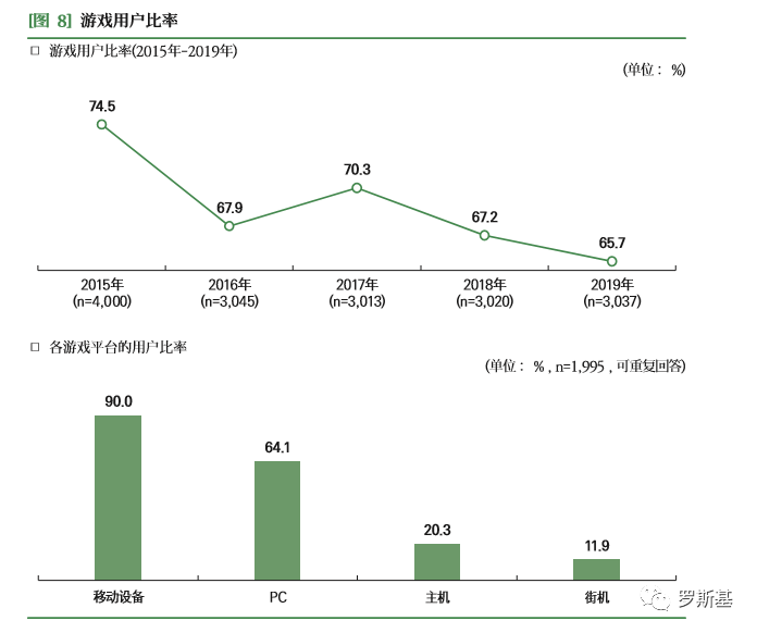 同时,玩过游戏的人(n=1,995)中,有98.7%在平时使用互联网。游戏用户们在因工作和学习以外的目的上网时,使用的设备依次为“智能手机”(97.1%)、“台式 机”(66.9%)、“笔记本和上网本”(48.9%)等。