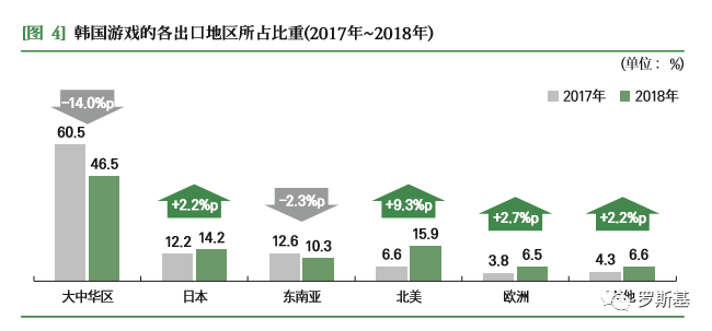 2018年,在韩国游戏的主要出口国家和地区中,“大中华区”(中国,中国香港和中国台湾合并为“大中华区”)以46.5%的比率占较大比重。接着依次为“北美”(15.9%)、“日本”(14.2%)、“东南亚”(10.3%)、“欧洲”(6.5%)。