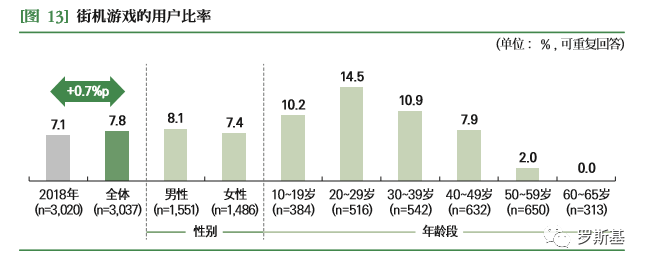 在调查对象中,有7.8%回答近期玩过街机游戏,这与2018年的调查结果(7.1%) 基本持平。按性别来看,男女用户的比率没有太大差距;按年龄来看,不满40岁的用户比率相对高于40岁以上的用户,尤其20~29岁的用户较多。