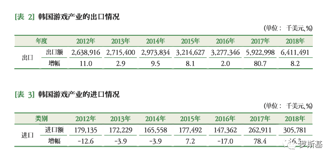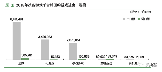 2018年,韩国游戏产业的出口额同比增长8.2%,达到641,149万美元(70,546亿 韩元,以韩国银行2018年年平均汇率中间价1,100.3韩元换算)。进口也同比增长 16.3%,达到30,578万美元(3,365亿韩元)。
