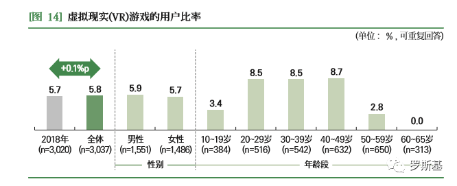 玩过虚拟现实(VR)游戏的用户比率为5.8%,这与2018年的调查结果(5.7%)基本持平。按性别来看,男女用户的比率没有太大差距;按年龄来看,20~49岁的用户比率相对高于其他年龄段。
