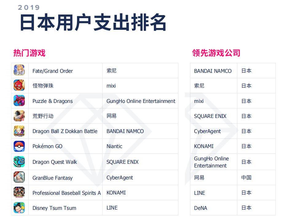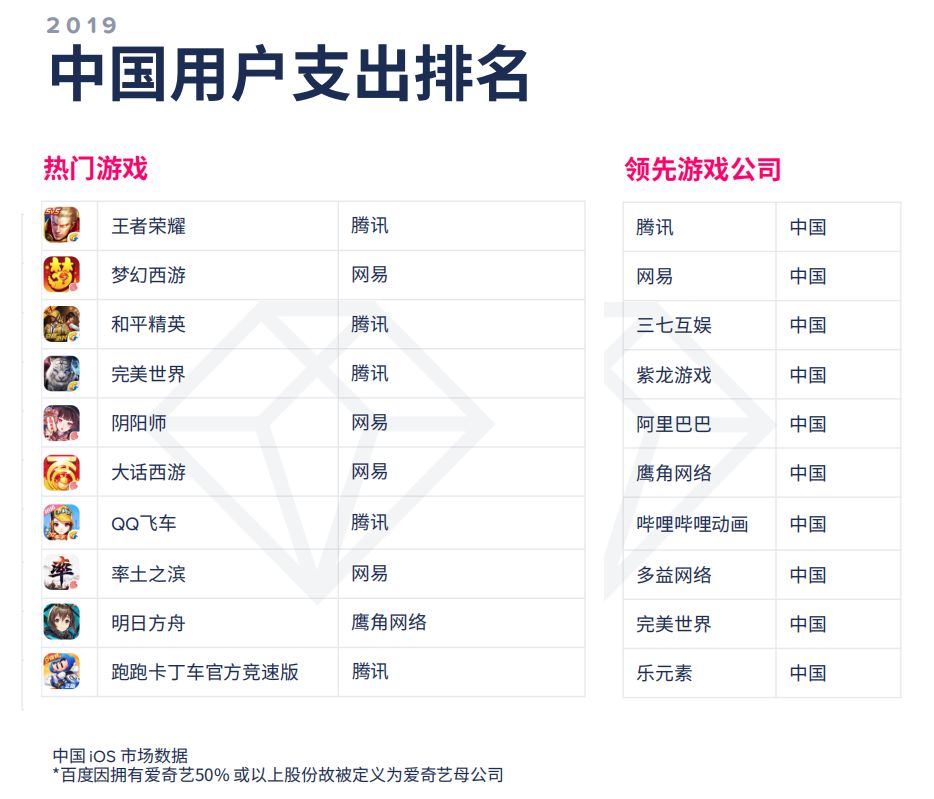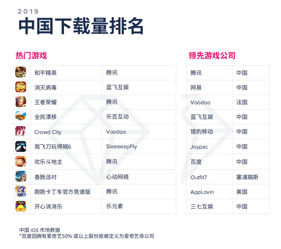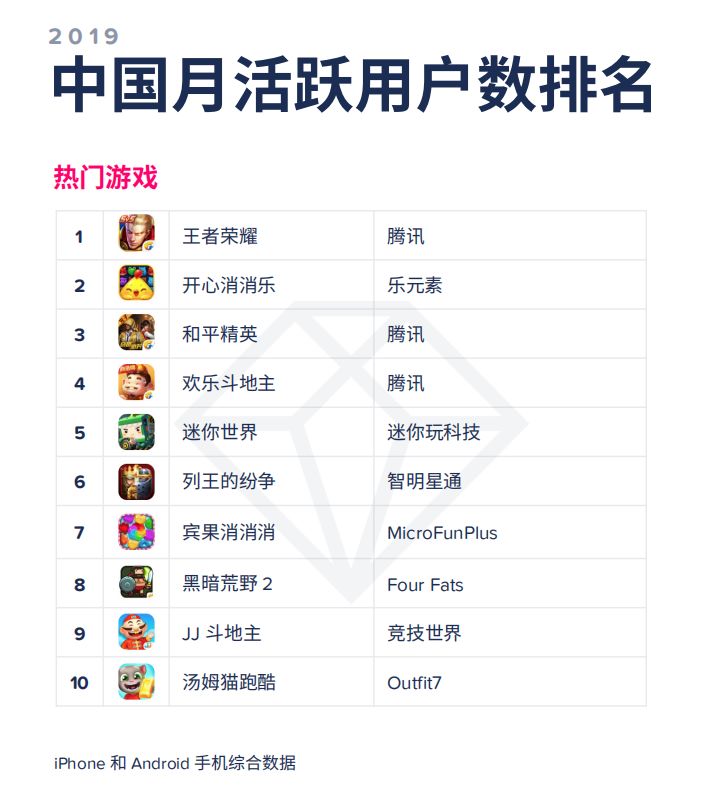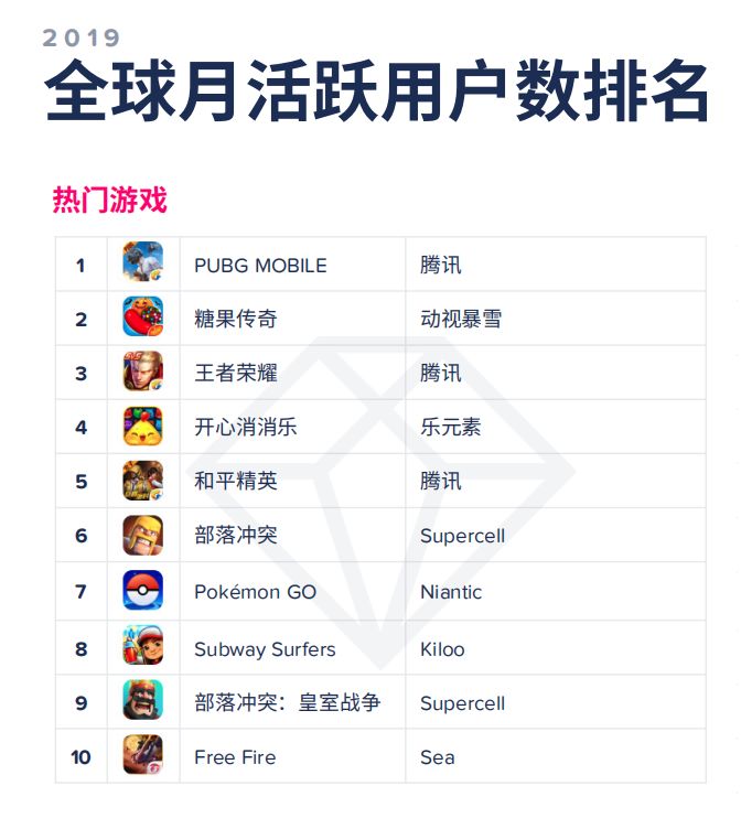 收入榜上,除了《王者荣耀》和《梦幻西游》继续霸榜一二外,变化较大的是《和平精英》和《完美世界》相继冲到三四位置,而《率土之滨》、《明日方舟》和《跑跑卡丁车》也相继进入TOP 10;下载榜上,《消灭病毒》、《全民漂移》、《我飞到玩得贼6》都是2019年的亮眼产品,而入围的中国厂商相比2018的两位足足增加到了七位;MAU方面,则少见地出现了一款SLG游戏《列王的纷争》,排名第六。