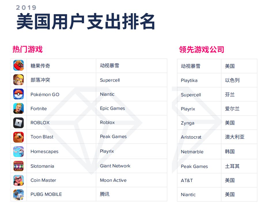 收入榜上,《糖果传奇》排名靠前,休闲类产品依然备受美国玩家青睐;下载榜上则基本清一色都是超休闲游戏,除了《马力欧赛车 巡回赛》和《使命召唤手游》这两个大IP产品;MAU榜首则依然是《精灵宝可梦GO》,此外填字游戏也有着庞大的用户基础,《Wordscapes》跟《New Words With Friends》都榜上有名。