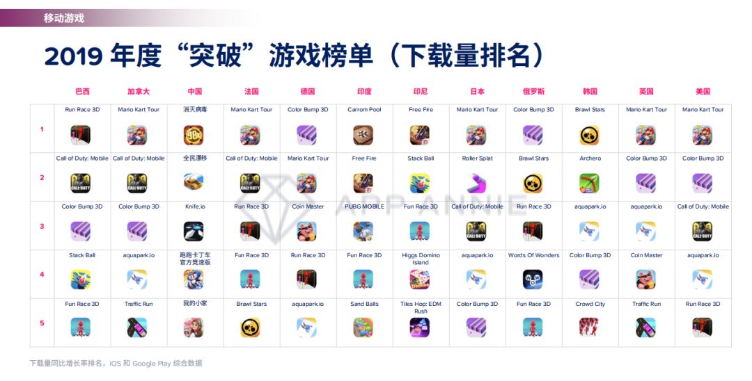 在2019年的下载量年度“突破”游戏榜单中,除了休闲游戏和竞技游戏依然是下载榜TOP 5的常客外,可以发现大游戏IP的号召力是全球性,像是《马力欧赛车 巡回赛》、《使命召唤手游》这样的新品都很受各个地区玩家的青睐。此外也可以看到,有着自己独特市场生态的中国在榜单上呈现出不同的态势。