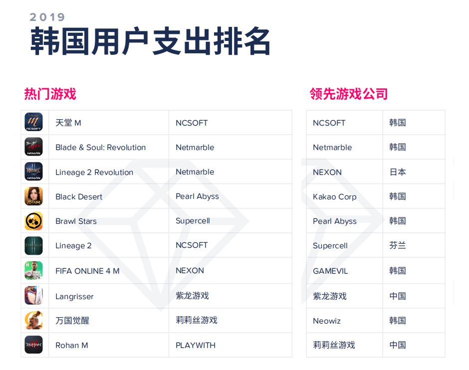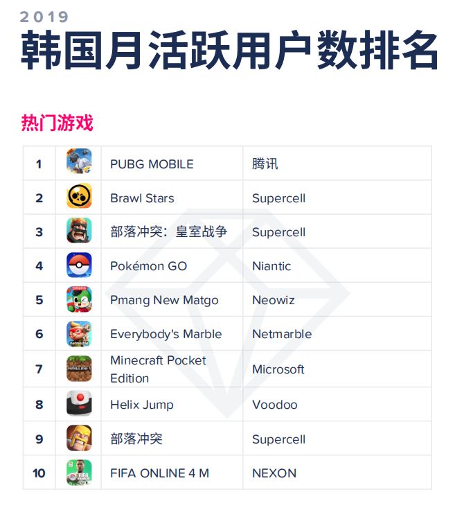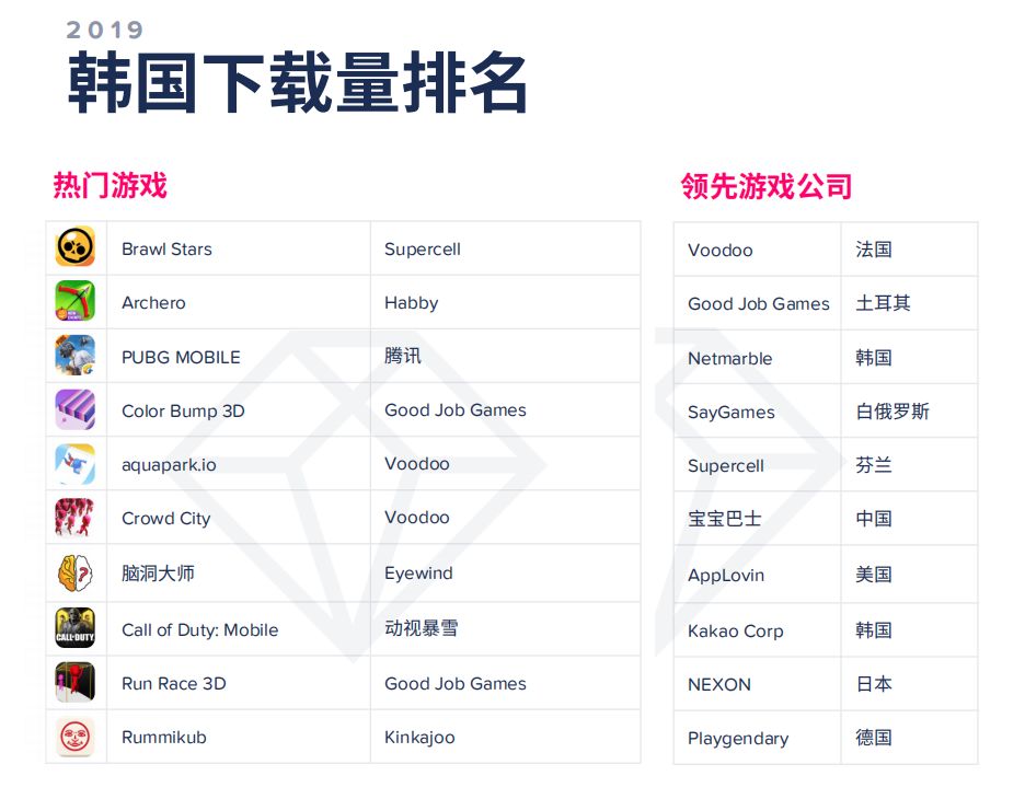 《天堂M》是2019年在韩国市场收入较高的游戏,MMORPG品类占据了榜上大部分位置,中国厂商有两款游戏入榜,分别是《梦幻模拟战》跟《万国觉醒》;在下载量上,Supercell的《荒野乱斗》一马当先,《弓箭传说》排在第二;而《荒野乱斗》同样再现身MAU榜单前列,这款主打休闲竞技的游戏似乎已经赢了韩国手游玩家的青睐,想必会在2020年为Supercell在亚洲地区的发展贡献更多力量。