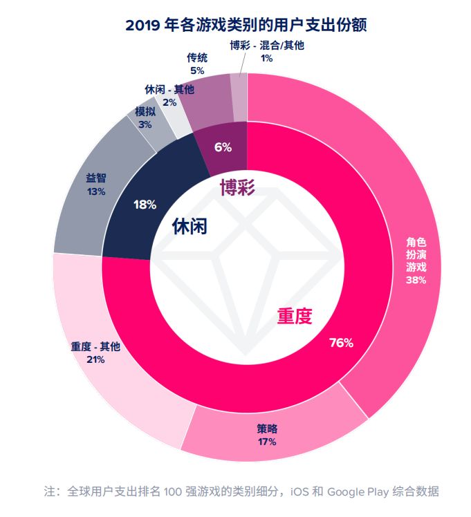 在收入方面,重度游戏则占据了76%的用户支出份额,其中角色扮演类占38%,策略类占17%。2019年收入很高的重度游戏的《命运-冠位指定》。