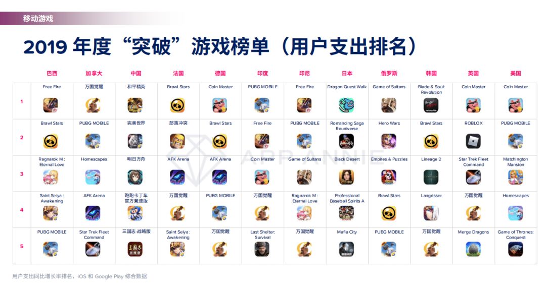 在用户支出年度“突破”游戏中,则每个国家的TOP 5都显得十分“个性化”,战术竞技类的《PUBG MOBILE》、策略类的《万国觉醒》、竞技类的《荒野乱斗》、博彩类的《金币大师》都在各个市场有很着突破性的表现,