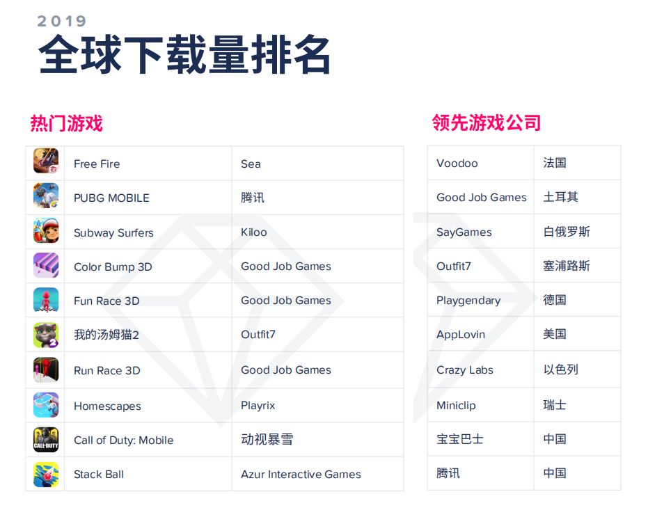 在收入榜上并未出现太大变化,索尼的《命运-冠位指定》继续成为全球高收入的移动游戏,中国厂商和日本厂商各占2席;下载榜上一个很大的变化要数Good Job Games和SayGames这两家新晋超休闲游戏厂商的崛起,凭借着多款游戏表现出色他们直逼Voodoo的领先地位,分列二、三位;在MAU榜上,去年排头部的《开心消消乐》则被《PUBG MOBILE》超越。