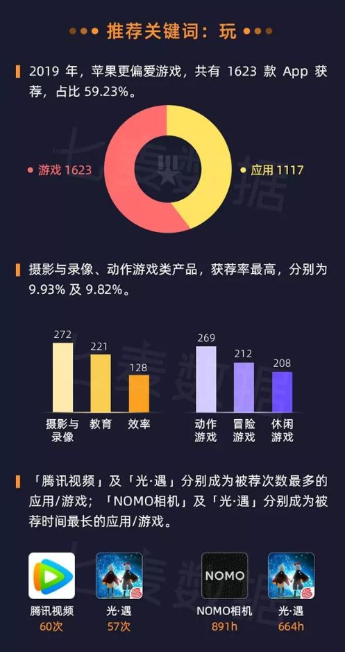 报告统计,2019年全年苹果共推荐2740个应用,其中游戏类App共计1623个,占比约为59.23%。其中,动作、冒险、休闲类是苹果是青睐的三个品类,约占推荐游戏42%。
