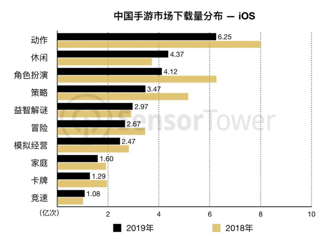 和全面上扬的收入相比,iOS在中国移动市场的下载情况值得引起行业警惕。与2018年的iOS下载数据相比,2019年10大品类中有7个类型均出现了不同程度的下滑,其中又以动作、角色扮演、策略三个品类的滑坡明显——动作品类下载量下跌了28%,角色扮演下跌近3成,策略类也减少了超过20%。由此可见,在新品匮乏的2019年,不仅老产品得到了更充分地耕耘,单个用户的价值也被更深度地挖掘了。