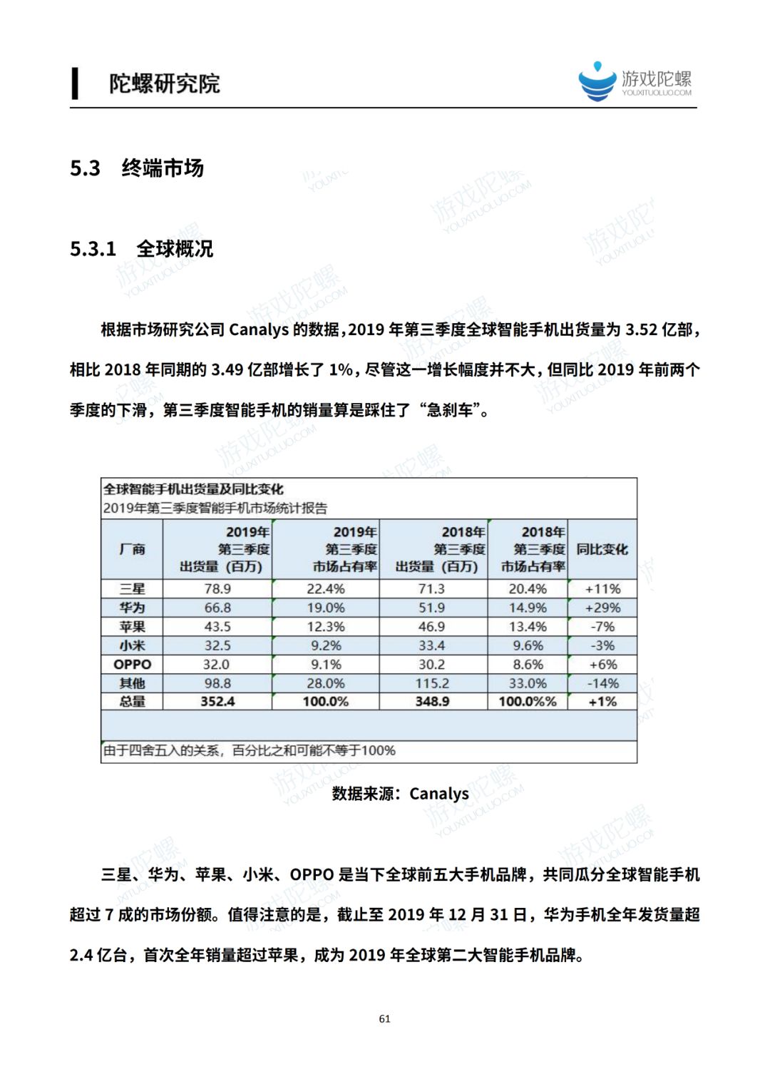 终端市场则以华为为主导,在智能手机市场整体下滑的状态下,华为仍能逆势增长,全年手机出货量超越苹果成为全球第二大智能品牌。同时,随着5G技术的普及,华为或将在2020年再次迎来新的增长点。
