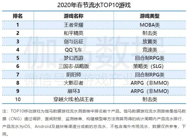根据伽马数据测算的春节流水TOP10,整体来看,前五名的游戏类型都不尽相同,玩家的口味更多元;腾讯是本次春节的大赢家,TOP5中共占3席,《王者荣耀》和《和平精英》毫无悬念的拿下前两名,《QQ飞车》位居第4。