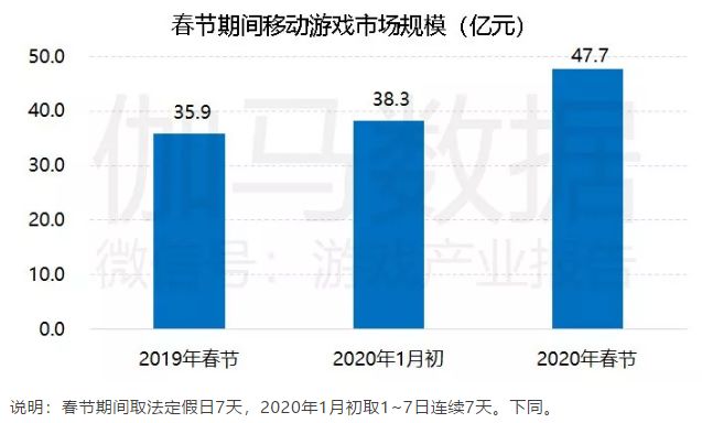 从具体的收入数据上,可以看到本次春节的更实际增长:2020年春节期间移动游戏市场规模达47.7亿元,2019年春节为35.9亿元,同比增长32.9%;2020年1月初的移动游戏市场规模为38.3亿元,较月初增长24.5%。