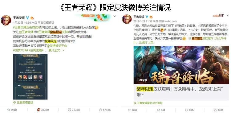 另一方面,同样是得益于玩家对游戏关注度的增长,尤其是对影响产品流水的限定皮肤活动的关注。从《王者荣耀》官方微博相关内容的关注程度来看,转发、评论、点赞数量均超去年同期10倍有余。