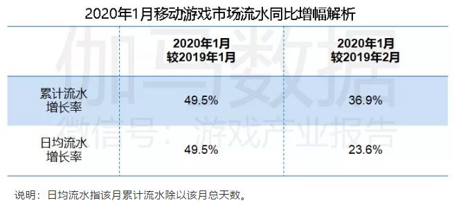 与2019年1月相比,2020年1月移动游戏市场累计流水增长率高达49.5%,平均每天流水增长率同样为49.5%。