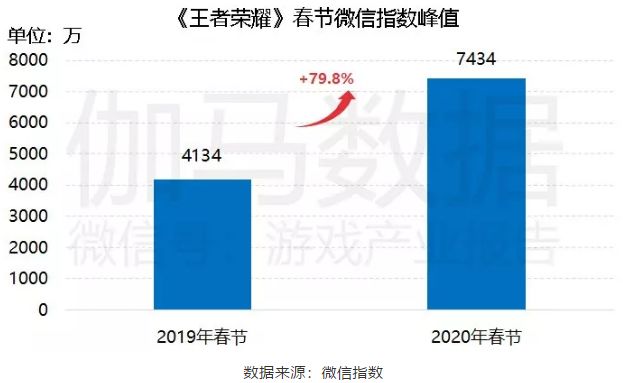 这种高增长一方面是由于疫情影响下,其游戏热度的上升。根据微信指数,春节期间《王者荣耀》微信指数峰值为7434(于除夕前一天鼠年限定皮肤活动的开启达到),同比2019年春节增长率达79.8%。