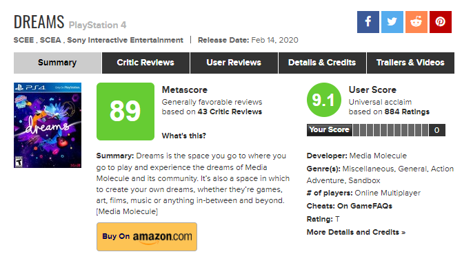 Jodie Azhar在文章中写道:“如果你渴望创作一款需要存储成吨数据、同时运算大量角色动画的游戏,或是一款希望实现高度精细操控的作品,那么《Dreams》或许无法满足你的需求。但你可以在《Dreams》中打造出那种有趣、精致、自己愿意花钱买的游戏。”