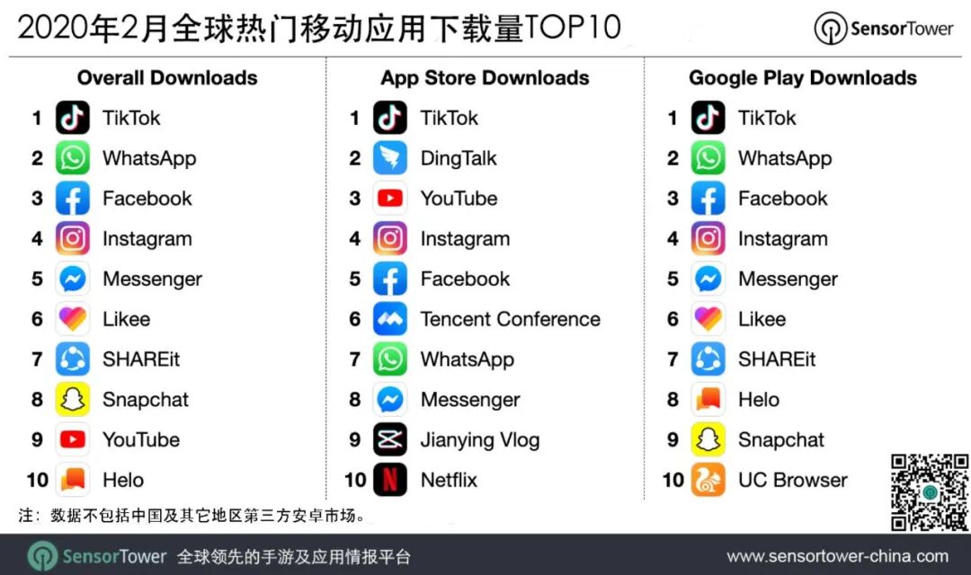 3月9日,Sensor Tower发布了2020年2月全球热门移动应用下载量TOP10。