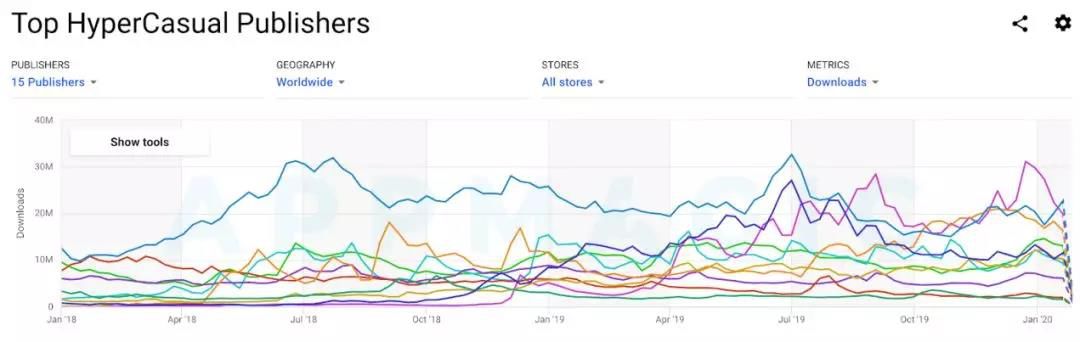 尽管超休闲的市场依然在稳定增长,大作的表现也一直都不错,但其发行的竞争已经愈演愈烈。Voodoo曾“独领风骚”,现在跟Lion Studios,Say Games以及Crazy Labs这三家厂商争夺市场:,他们会时常交换排行榜的位置。中层发行商也在变多,2020年1月有42家发行商有超过1000万的应用下载量。