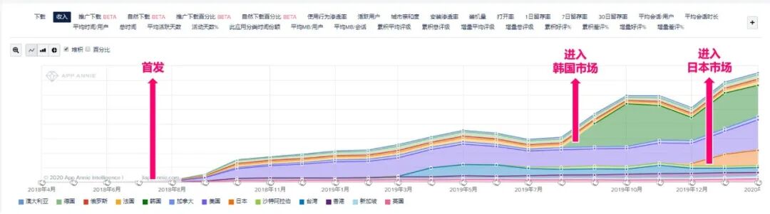国产出海游戏最近风头正盛的是《万国觉醒》和《明日方舟》,分别于2019年12月和2020年1月登陆日本市场。两款游戏均是经其他市场验证过的爆款产品,再加上莉莉丝在买量上的疯狂投入、以及Yostar深耕日本发行所积累的成功经验,它们在日本手游市场大获成功也可以说是情理之中。