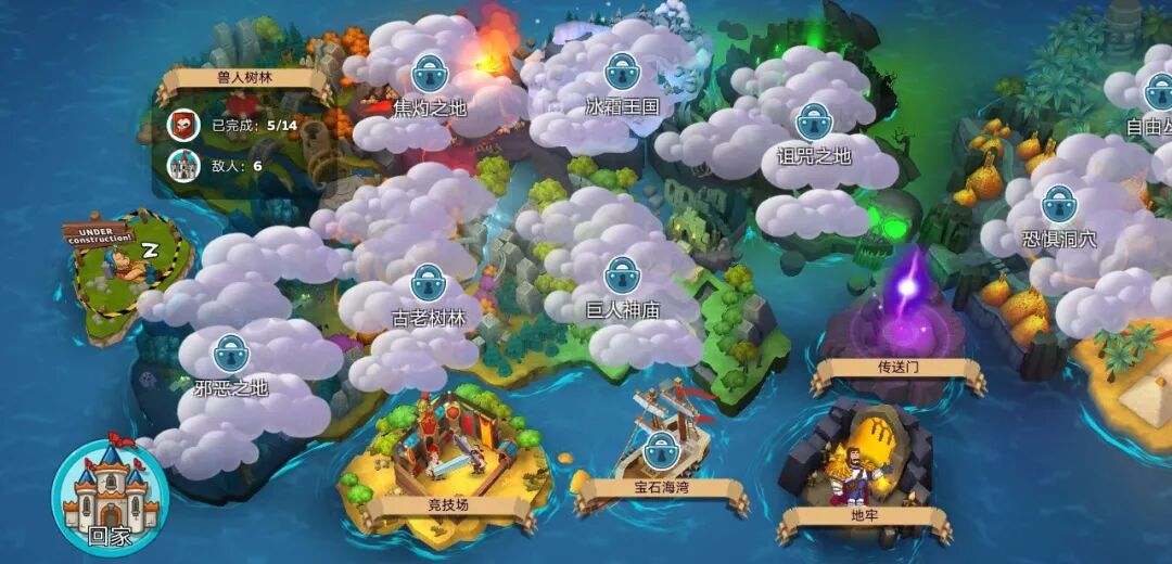 随着王座室(相当于主城)等级提升,更多玩法功能相应开放,比如建造不同功能的房间、世界区如竞技场(王座室5级开放)、传送门(王座室6级开放)等战斗场所开放。
