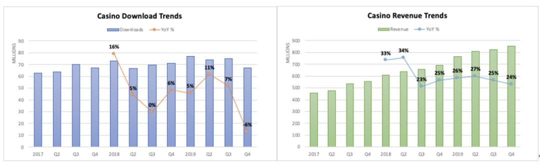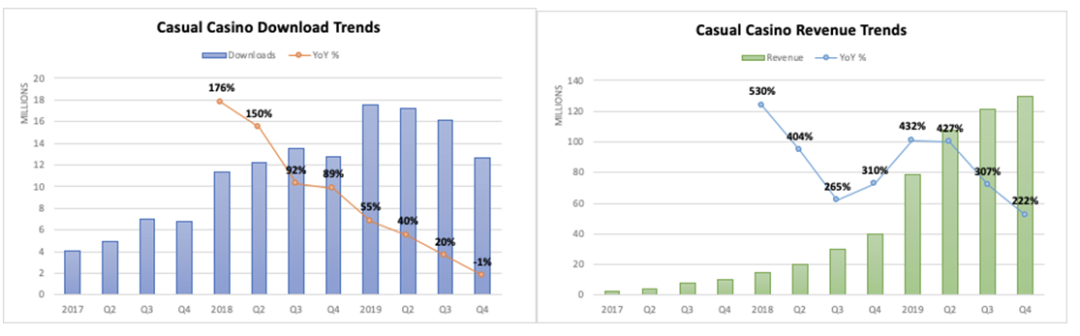 另外一个机会点,是以《金币大师》为首的休闲博弈类,通过将老虎机与休闲玩法相结合,成功扩大了用户范围。数据显示,虽然休闲博弈类下载量增速下跌明显,用户数量和博弈类游戏整体趋势相同,已接近天花板。但其作为最新衍生出的品类,2019年总收入4亿美金,同比增长316%,也仍旧有较大利润可挖。
