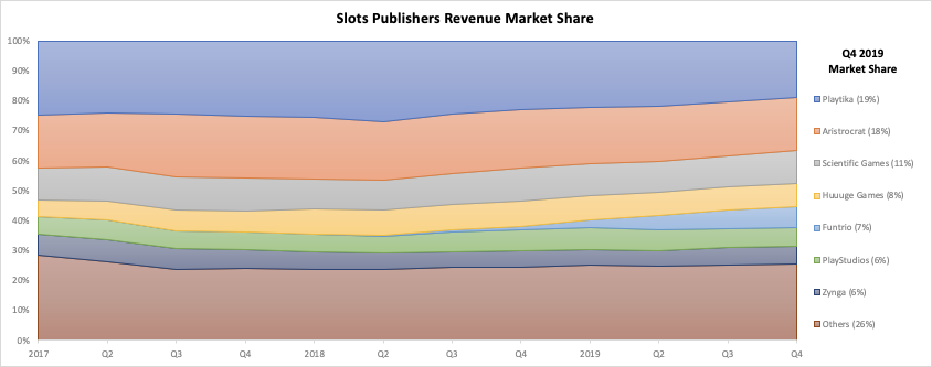 老虎机游戏2019年收入为23亿美金,同比增长14%;相比2018年的70%有所放缓,不过它仍是博弈类游戏最大的子类别,占据了70%的市场份额。市场大,也意味分羹的竞争者多,如Playtika、Aristrocrat、Scientific Games 和 Huuuge Games ;但博乐科技(Funtrio)仍凭借《Cash Frenzy Casino》和《Lotsa Slots》两款老虎机游戏,成功从海外头部厂商中抢占了7%的市场份额,并凭借这7%在中国出海厂商收入榜中发光发热。这也意味着老虎机游戏市场仍然有新产品的发展空间。