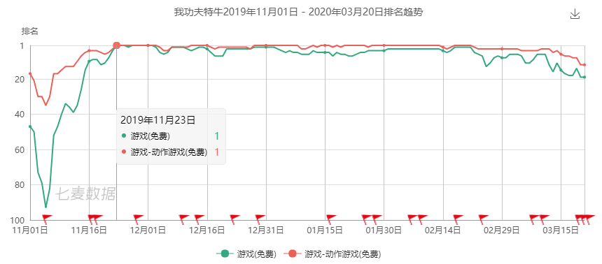 在Ohayoo的帮助下,《我功夫特牛》于11月底顺利登顶iOS免费榜第一名,随后在免费榜上维持长达两个多月TOP10,成为了2019年的休闲领域头部爆款之一。
