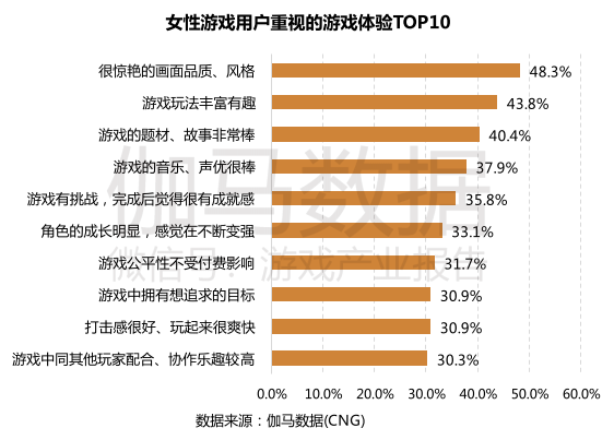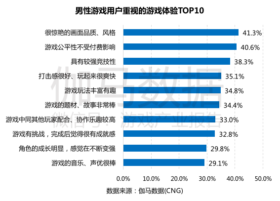 玩法创新外, 无论男女玩家,都认为超高的画面品质是重要的游戏要素。此外,女性玩家更重视游戏的题材、故事有趣(40.4%),音乐、声优好听(37.9%)等;男性玩家则注重游戏公平性(40.6%),要具有较强的竞技性(38.3%),以及有爽快的打击感(35.1%)。