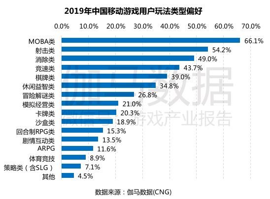 不过,中国移动游戏用户玩法偏好榜中,MOBA和射击类霸占前两名,占比分别为66.1%和54.2%。玩法的人气与整体流水表现并非正相关。