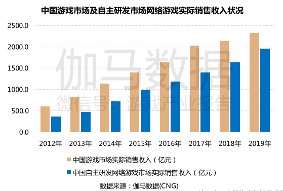 2019年中国自研游戏收入近2000亿元,占整个市场的收入的84%