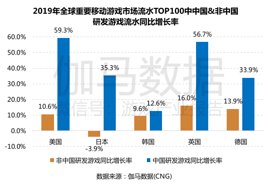 中国自研游戏在全球主要市场增幅大大领先于非国产,在美国增长率高达59.3%