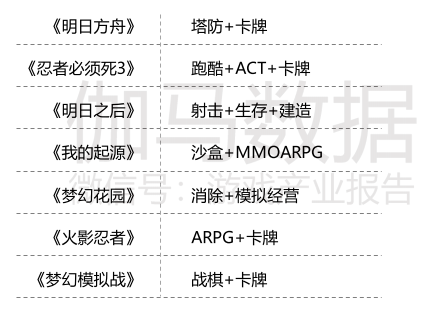 伽马数据认为,不同类型的玩法融合或将成为突破口,这将是产品研发的重要机会,从而带来用户覆盖面和付费水平的双向提升,比如融合了塔防和卡牌的《明日方舟》。