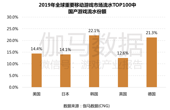 中国自主研发游戏中,移动游戏在全球头部市场中极具竞争优势。2019年全球重要移动游戏市场流水TOP100中,韩国市场的中国产游戏流水份额占比较高,为22.1%;其次为德国、美国、日本和英国,各自占比21.3%、14.4%、14.1%、12.6%。