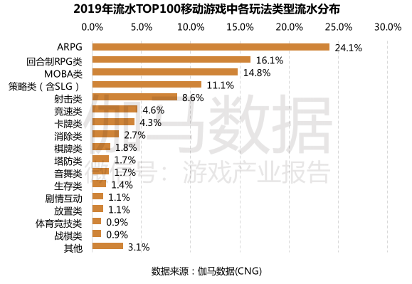 从玩法类型来看,2019年流水TOP100移动游戏中,ARPG类营收能力较强,流水占比达24.1%;MOBA类仅排第3,流水占比16.1%;射击类第5,流水占比8.6%。