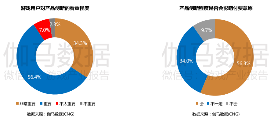 根据伽马数据的用户调查,超9成的用户看中创新,且有近6成的用户认为产品创新程度会影响付费意愿,可见企业在游戏玩法上的创新能力是其研发竞争力的重要元素。且自2018年以来,游戏市场规则整改,玩法创新的精品游戏更容易获得高收益。