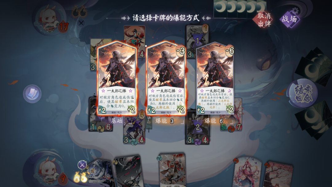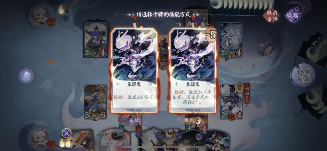 比如烟烟罗就是一个典型,她强大的输出能力完全建立在“能量”的积攒上。其技能卡中将能量数直接转化为追加伤害的效果,让她有了“能量越高,输出越强”的特性,可谓是简单粗暴。而同样有着“能量输出”定位的镰鼬,其爆能效果则普遍为追加发动其他技能卡,从而达到输出增幅的效果。可以说,定位类似的式神,在不同的能量运用思路下,也有着截然不同的表现。