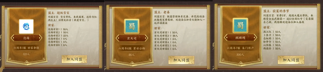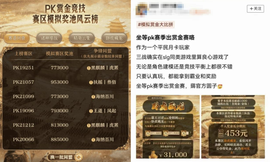 对核心玩家而言,“官方亲自下场发军费”这种事放眼整个品类,也称得上是破天荒头一遭,无疑提供了很强的参与驱动力。甚至很多SLG圈层内其他游戏的知名大盟,例如麒麟阙、沧海、玄天司、大咩王朝,以及寒朝、小字、元气团、龍骧等等,也都纷纷宣布入局《三战》,提前开启抢人模式,为游戏率先拉动了一波重要的玩家流量。