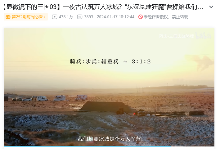 打开B站这样的内容社区,你会发现在“三国”关键词下,《三战》已经产生了多个三国话题的爆款长视频内容,像是“一夜古法筑万人冰城”的大型试验纪录片,播放量已经超过了430万。