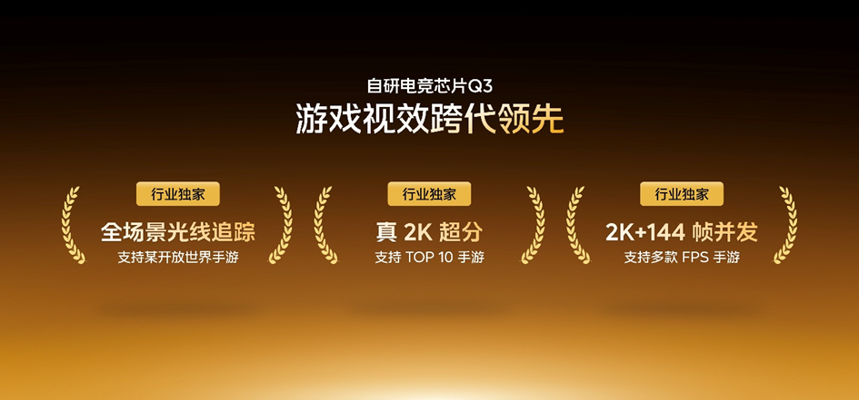 自研电竞芯片 Q3 是 Q 芯片的集大成之作,是行业少有具备“全场景光线追踪+游戏超分+游戏超帧”能力的独立显示芯片,采用全新硬件架构,通过 QNSS 超级渲染引擎、全场景自研光线追踪技术和 AI 核,实现性能、能效、缓存、功耗制程等各项数据的全维度领先,是真正的“手机独立显卡”,引领游戏视效体验来到媲美主机视效的时代,首款搭载机型为 iQOO 15。