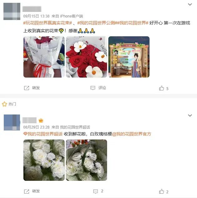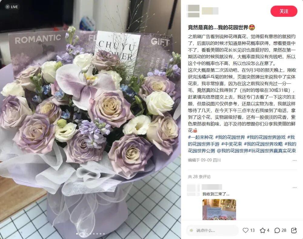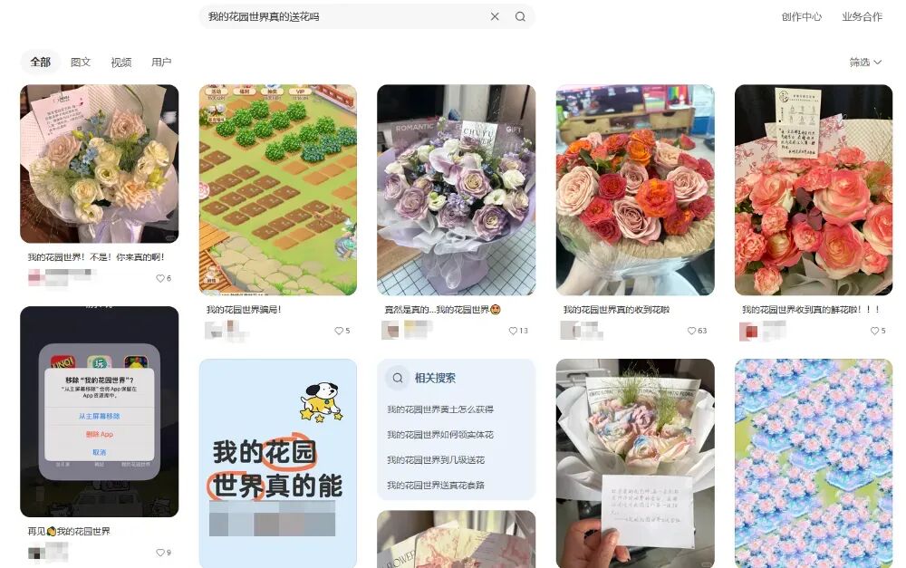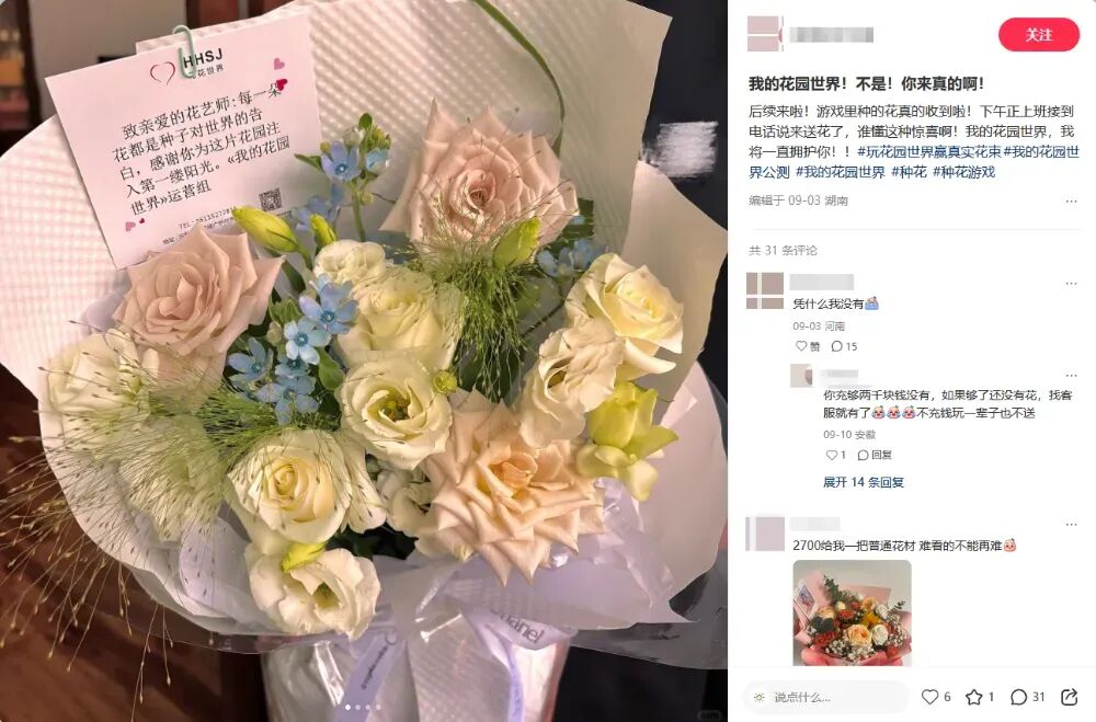在小红书、微博等女性用户聚集的社交媒体,也有不少玩家晒出了“种花得真花”的图片,并分享了种花攻略。这种真人“种草”的行为,可能吸引了一些在弃坑边缘的非深度玩家,以及感兴趣但又尚在观望的泛用户。