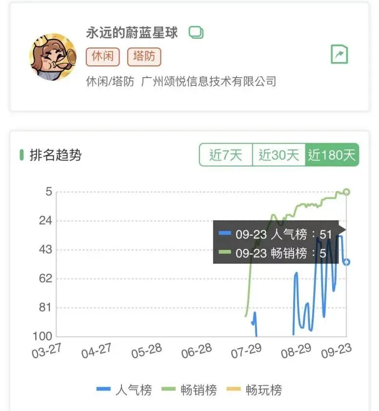 回顾两款产品的发行轨迹,《永远的蔚蓝星球》5月末率先上线APP手游端,再于7月末登陆微信小游戏平台,短短一个多月便一路攀升,9月初已挺进TOP5,目前稳居前10。
